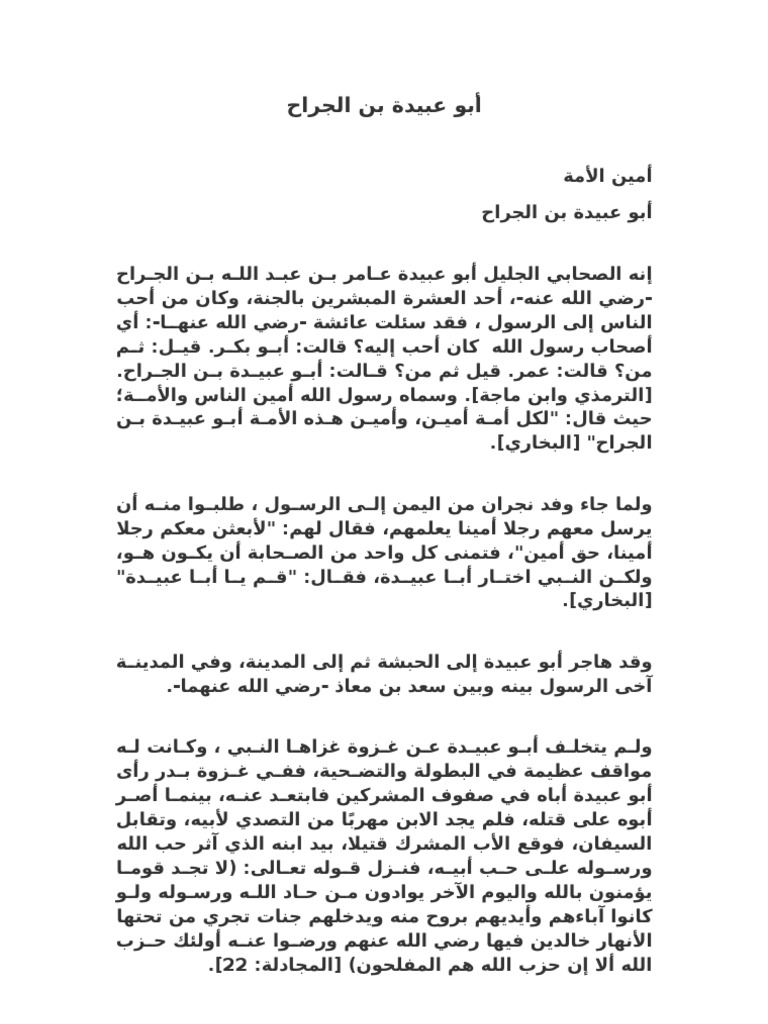 أبو عبيدة بن الجراح pdf. أبو بكر الصديق وعثمان بن عفان وأبو عبيدة بن الجراح. إن لكل أم ة أمينا. عامر بن عبد الله بن الجر اح بن هلال بن أ ه ي ب ويقال. ثلاثة من قريش أصبح الناس وجوها وأحسنها أخلاقا وأثبتها حياء إن حدثوك لم يكذبوك وإن حدثتهم لم يكذبوك.