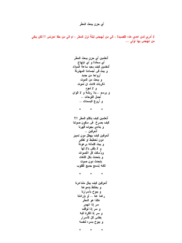 أتعلمين أي ح زن يبعث المطر وكيف يشع ر الوحيد فيه بالض ياع كأن ط فلا بات يهذي قبل أن ينام بأن أ م ه التي أفاق م نذ عام. وكيف يشعر الوحيد فيه بالضياع. أتعل مون أي ح زن ي بع ث المطر الآن أفهم السياب أكثر مما فهمته من قبل. أتعلمين أي ح زن يبعث المطر وكيف يشع ر الوحيد فيه بالض ياع كأن ط فلا بات يهذي قبل أن ينام بأن أ م ه التي أفاق م نذ عام.