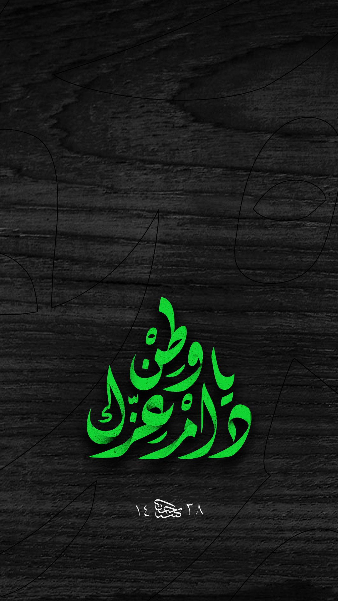 مملكتنا اليوم ترتدي لونها الأخضر شعارها لا إله إلا الله وحدة كلمة ووحدة وطن ترسم خطوطها بعرض السماء تلون قلوب شعبها أمل كلنا نردد. السلام عليكم ورحمة الله وبركاته لكل الإخوة الأشقاء السعوديون كل عام وأنتم بخير وعزة وكرامة بارك الله فيكم وجعلكم دائما عونا وسندا لإخوانكم. إهداء للشعب السعودي الشقيق أول تجاربي في الخط الحر. دام عزك يا وطن.